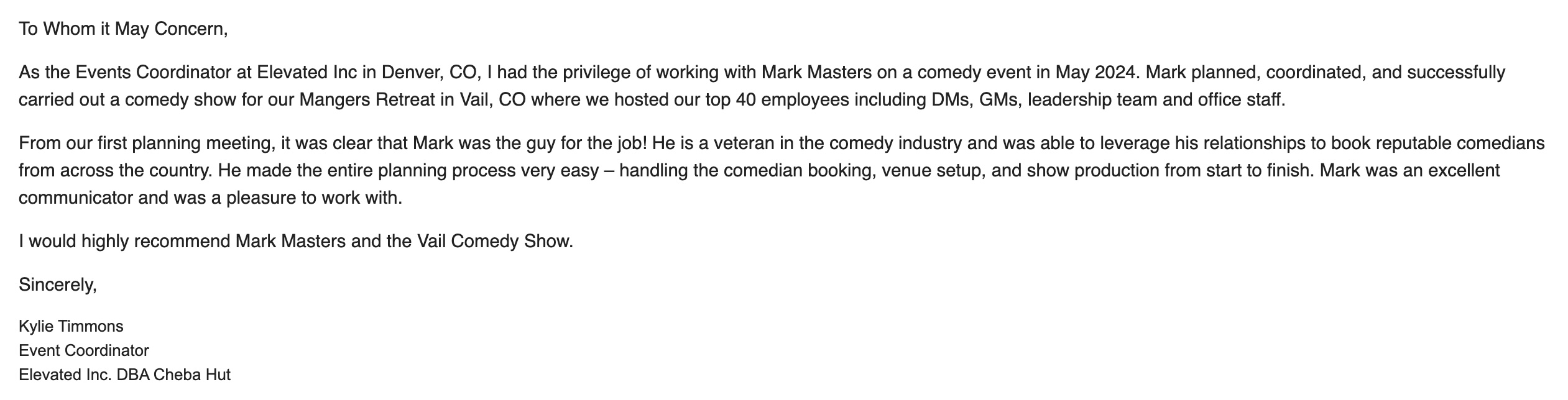 A few people have written some nice things about me, there are a lot of comedians and you have a choice when you make your booking decisions, perhaps some thoughts from a Fire District Chief, Elevated Inc., Vail Resorts Inc., organizers of corporate events or the Director of Development of a wildlife non-profit will help influence your decision about bringing comedy to your private event. Learn more about Mark Masters Comedy Corporate Speaking.